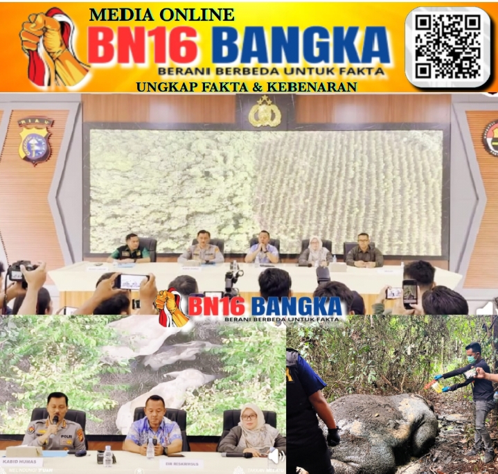 Pekanbaru, BN16-Bangka.com – Polda Riau mengadakan konferensi pers terkait penemuan bangkai gajah di Media Center Polda Riau. Bangkai gajah tersebut ditemukan pada Senin, 2 Februari 2026, di Blok C99 areal izin konsesi PT. RAPP Desa Lubuk Kembang Bunga Kec. Ukui Kab. Pelalawan. Jum’at (6/02/2026).