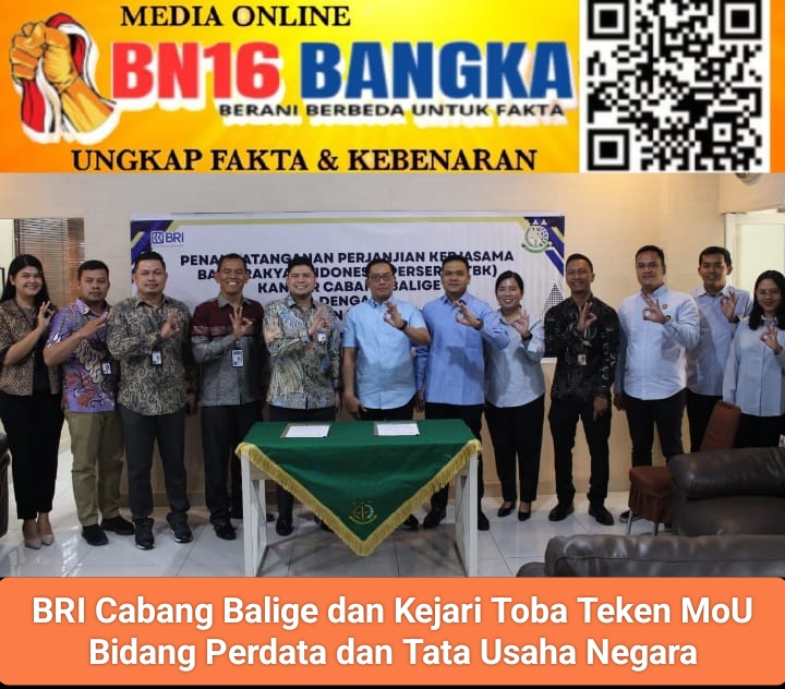 TOBA, BN16BANGKA—Perbankan PT Bank Rakyat Indonesia(BRI)Cabang Balige resmi menandatangani Perjanjian Kerjasama atau Memorandum of Understanding(MoU)dengan Kejaksaan Negeri(Kejari) Toba di aula utama Kejari Toba(Jumat,17/4/2026). Head Office BRI BO Balige, Namal Kautsar tampil mengenakan batik corak lengan panjang dan Kepala Kejaksaan Negeri Toba Muslih tampil dengan kemeja biru lengan pendek dalam proses penandatangan MoU tersebut.