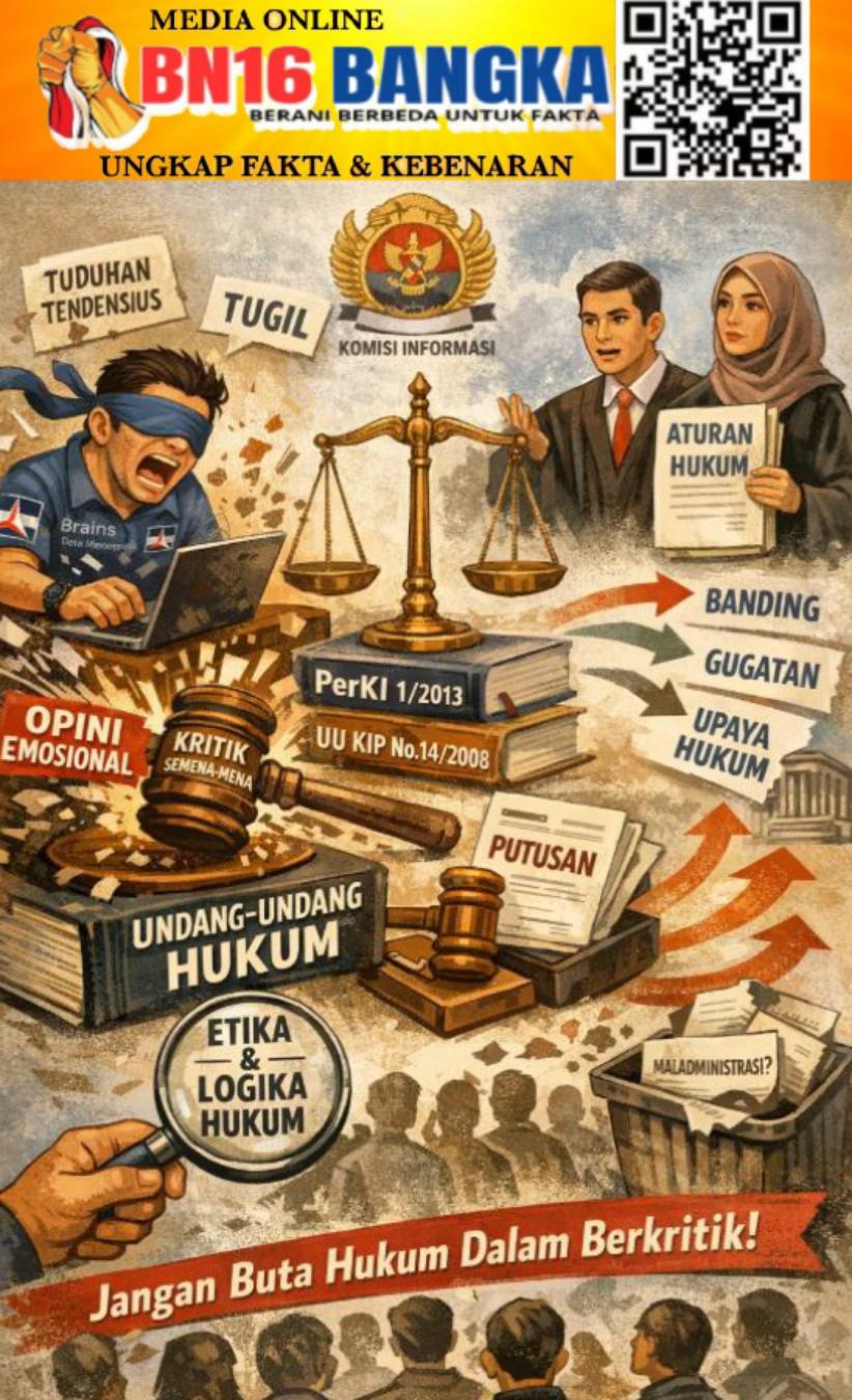 Pangkalpinang – Tulisan opini yang disampaikan oleh Edi Irawan, ST, dengan tajuk yang menyerang Komisi Informasi Provinsi Kepulauan Bangka Belitung, justru memperlihatkan ironi yang sulit diabaikan. Alih-alih menyajikan kritik berbasis hukum dan argumentasi yang objektif, narasi yang dibangun cenderung emosional, tendensius, dan jauh dari prinsip-prinsip dasar dalam memahami sistem hukum serta mekanisme penyelesaian sengketa informasi publik.