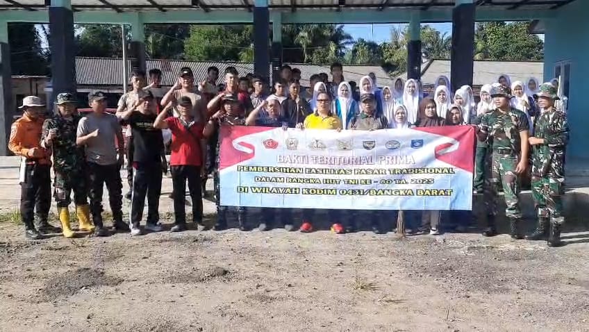 Bangka Barat– Koramil 431-03/Kelapa Melaksanakan Pembersihan Fasilitas umum bersama stakeholder terkait melibatkan masyarakat dan anak-anak SMP N 1 kecamatan kelapa melaksanakan kegiatan Karya Bhakti dalam rangka menyambut HUT TNI ke-80 tahun 2025. Bertempat di pasar Ke. Kelapa. Kab. Bangka Barat. Jum’at ( 19/09/2025 )