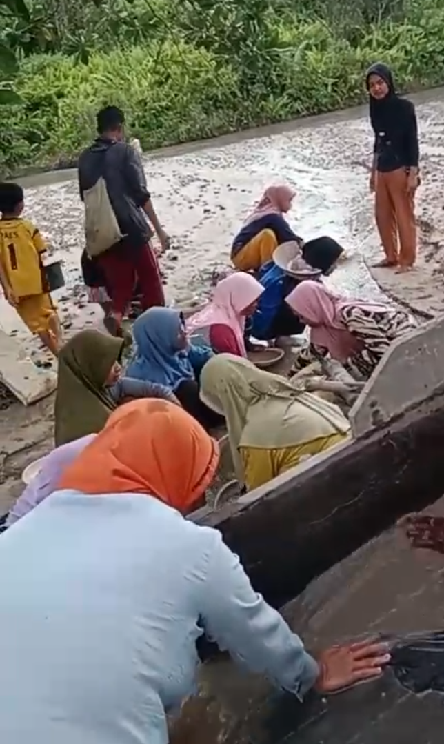 ​Dalam foto ini, para ibu tampak menunduk, fokus mencari butiran-butiran timah yang tersembunyi. Beberapa dari mereka memakai jilbab, yang menunjukkan bahwa perjuangan ini adalah bagian dari kehidupan sehari-hari mereka.