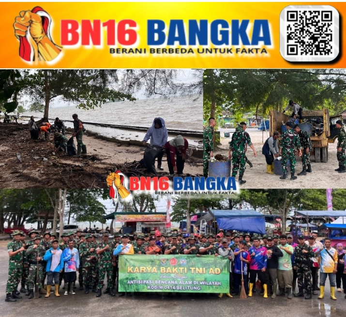 Belitung, BN16-Bangka.com – Dandim 0414/Belitung Letkol Inf Teguh Adie Setiawan, S.Sos pimpin kegiatan Karya Bakti dalam rangka “Antisipasi Bencana Alam” berupa pembersihan Pantai Tanjung Pendam bertempat di Jln. Kemuning Desa. Parit Kec. Tanjung Pandan Kab. Belitung. Rabu (31/12/2025).
