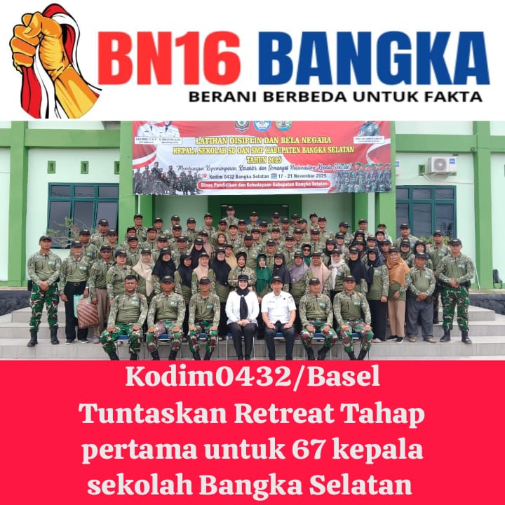 *BANGKA SELATAN*– TOBOALI. Kodim 0432/Bangka Selatan sukses menuntaskan kegiatan Retreat Pembentukan Karakter bagi para kepala sekolah tingkat SD dan SMP se-Kabupaten Bangka Selatan. Program tahap pertama ini berlangsung pada 17–19 November 2025 dan diikuti 67 peserta di Makodim 0432/Basel, Jalan Raya Gadung, Toboali.