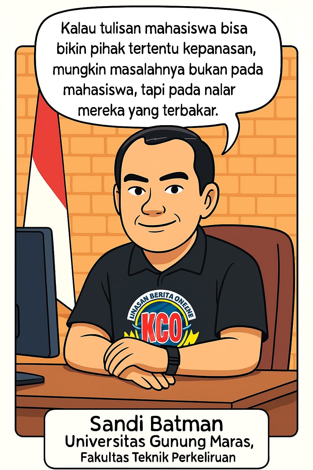 Saya, Sandi Batman, mahasiswa Universitas Gunung Maras jurusan Teknik Perkeliruan, jadi ikut heran. Seolah kalau mahasiswa menulis dengan argumen ilmiah, otomatis ada “sponsor misterius” di belakangnya.