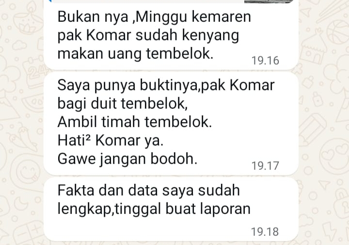 “Bukannya minggu kemarin pak KMR sudah kenyang makan uang hasil Tembelok? Saya punya buktinya pak KMR bagi-bagi duit Tembelok,” tulis Fe dalam pesan yang kini menjadi buah bibir.