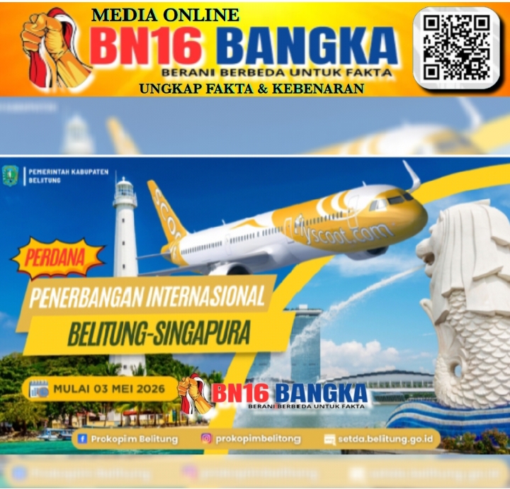 Belitung, BN16-Bangka.com – Pemerintah Kabupaten Belitung memastikan kesiapan menyambut penerbangan internasional perdana maskapai Scoot Airline dengan rute Singapura ke Belitung (Tanjung Pandan) yang dijadwalkan mulai beroperasi pada 3 Mei 2026 mendatang. Penerbangan ini akan beroperasi rutin dua kali seminggu, yakni; setiap hari Rabu dan Minggu.