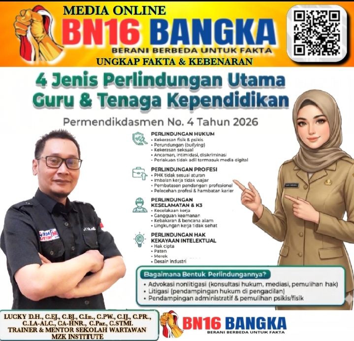 Bangka Belitung, BN16-Bangka.com – Pemerintah menetapkan Peraturan Menteri Pendidikan Dasar dan Menengah Republik Indonesia Nomor 4 Tahun 2026 sebagai bentuk komitmen negara dalam memberikan perlindungan menyeluruh bagi Pendidik dan Tenaga Kependidikan dalam pelaksanaan tugas profesionalnya.