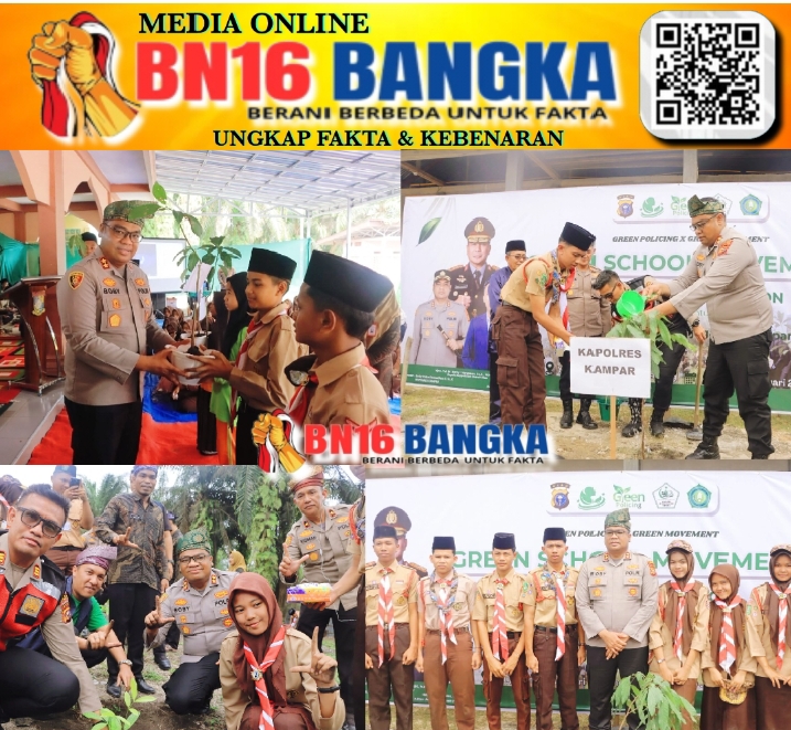 Tapung-Riau, BN16-Bangka.com – Polres Kampar bekerja sama dengan Persatuan Hijau Riau (PHR) dan Yayasan Madrasah Aliah Al-Muhajirin menggelar sosialisasi Green Policing dan Green Movement, serta penanaman pohon di Desa Pancuran Gading, Tapung, Kamis (29/01/2026).