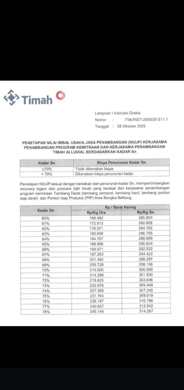 Berdasarkan dokumen internal perusahaan yang beredar dan merujuk pada hasil kesepakatan, penetapan nilai imbal usaha jasa penambangan (NIUJP) kerjasama penambangan program kemitraan dan kerjasama penambangan timah alluvial ditentukan berdasarkan kadar SN.