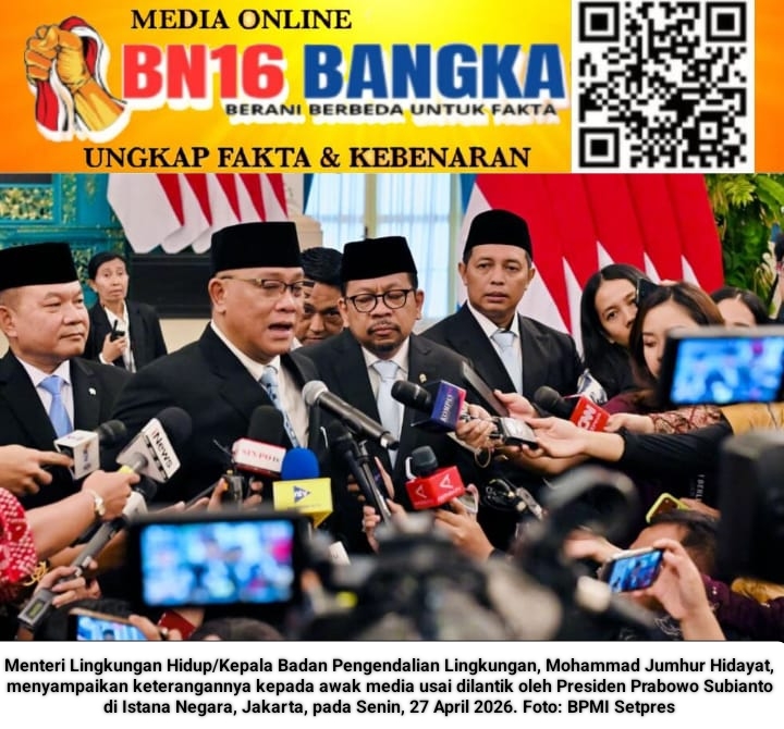 Jakarta,BN16BANGKA—Presiden Prabowo Subianto resmi melantik Mohammad Jumhur Hidayat sebagai Menteri Lingkungan Hidup/Kepala Badan Pengendalian Lingkungan Hidup di Istana Negara, Jakarta, pada Senin, 27 April 2026. Usai menjalani prosesi pelantikan, Jumhur menyampaikan bahwa terdapat sejumlah agenda yang siap untuk segera dijalankan.