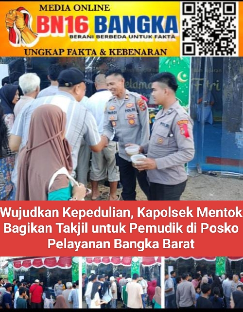 MENTOK,BN16BANGKA.COM– Memasuki musim mudik tahun 2026, jajaran Polsek Mentok menunjukkan aksi nyata kepedulian terhadap masyarakat. Kapolsek Mentok, Iptu Rusdi Yunial, S.H., M.H., turun langsung membagikan paket takjil gratis kepada para pemudik yang melintasi depan Posko Pelayanan Polres Bangka Barat pada Selasa (17/03/2026).